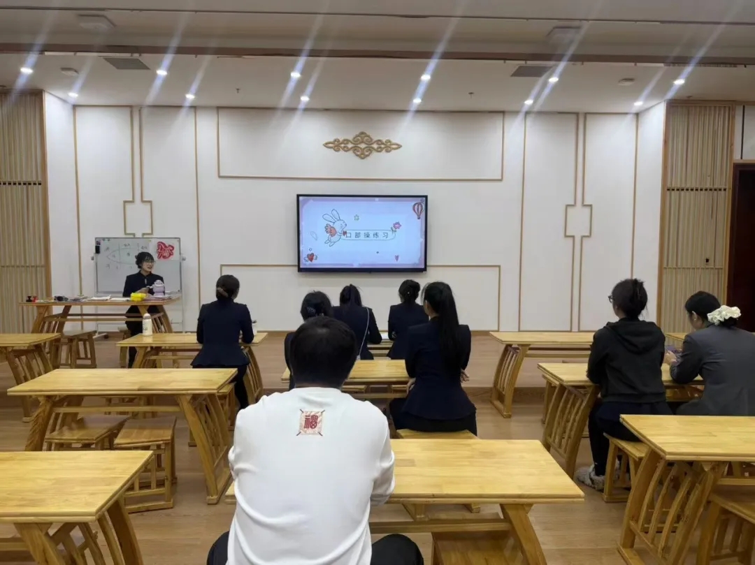 (第十一期)万绍彤带领讲解员进行发声技巧练习,课程以胸腹式呼吸法、口部操和绕口令为重点,通过口部操的训练,可以实现口腔、胸腔的共鸣,有助于字音发音的圆润,达到字正腔圆的效果。