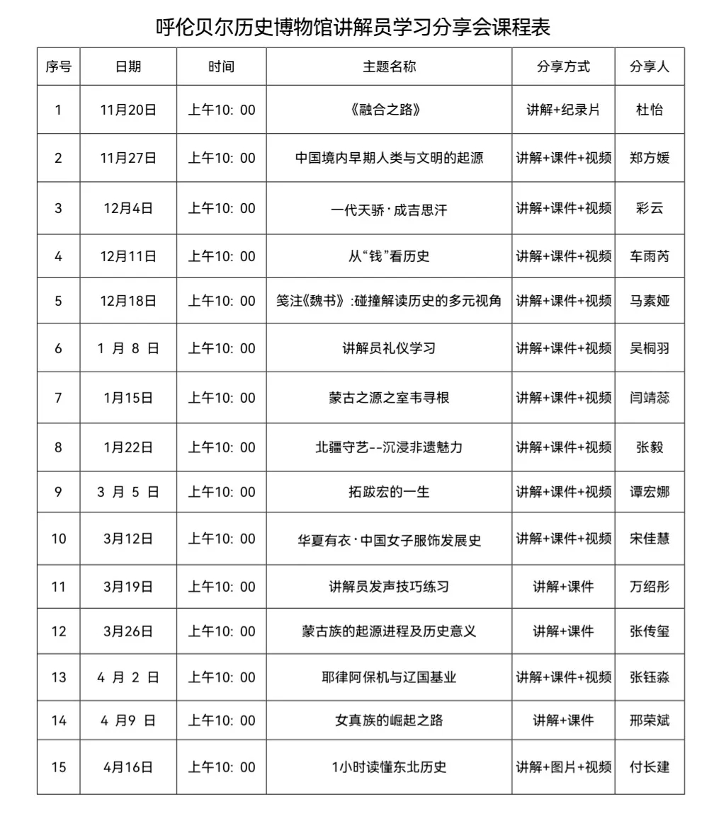 学习不止,成长不歇!我们以学习为桥梁,将个体的经验转化为团队力量,将零散的知识凝聚为传播的力量。未来,呼伦贝尔历史博物馆讲解团队将继续以学赋能、以讲传韵,让每一位讲解员都能在交流中成长,用更专业、更生动的讲述,让馆内展品“活”起来,让呼伦贝尔的历史文脉,更好地传递给每一位观众。